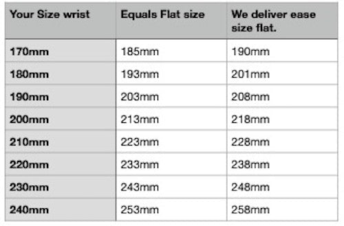 240mm (True wrist size) equals 253mm, = 258mm we will deliver this size when flat.
