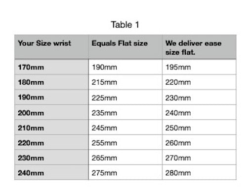 200mm (True wrist size) equals 235mm, = 240mm we will deliver this size when flat.
