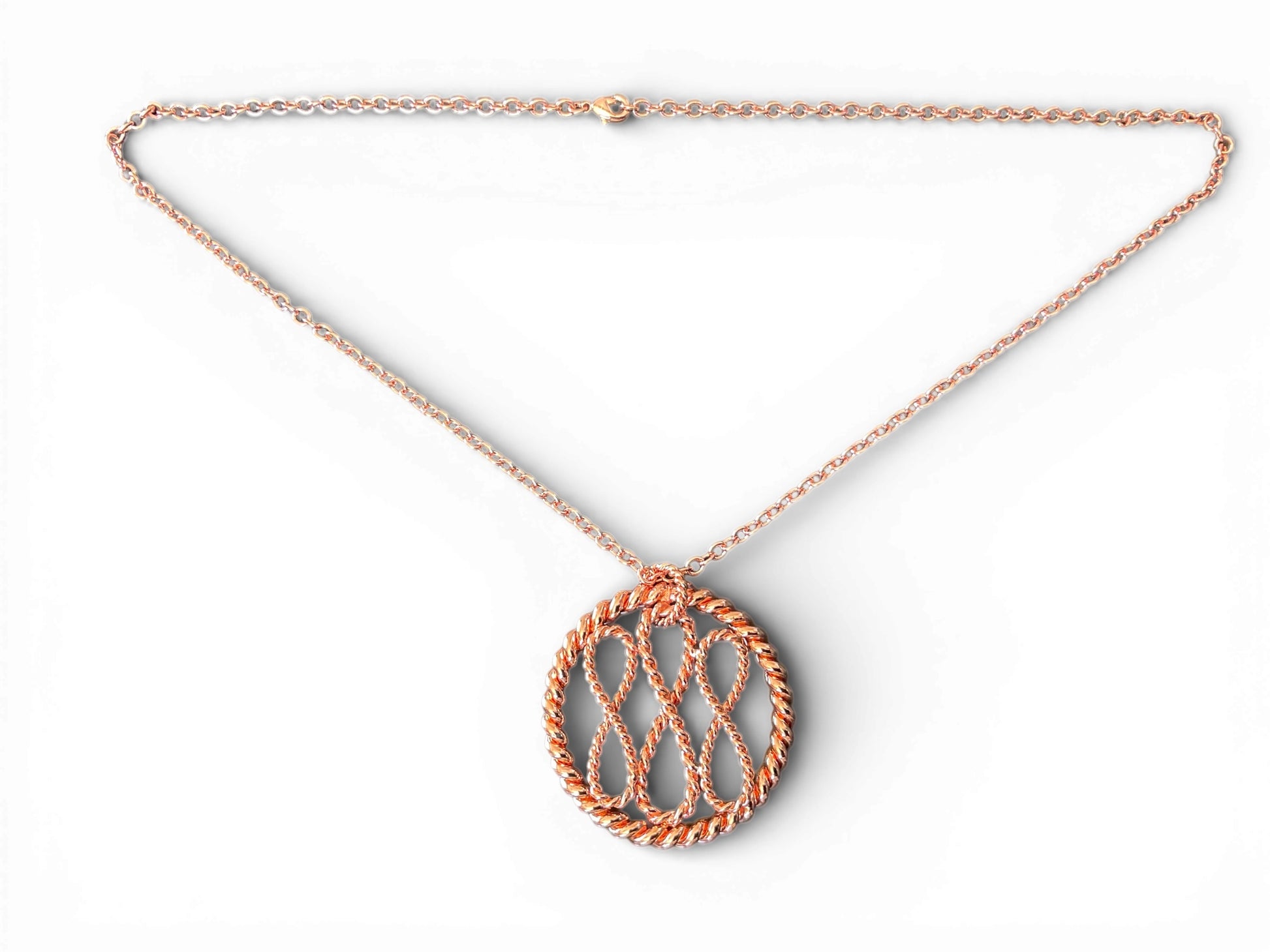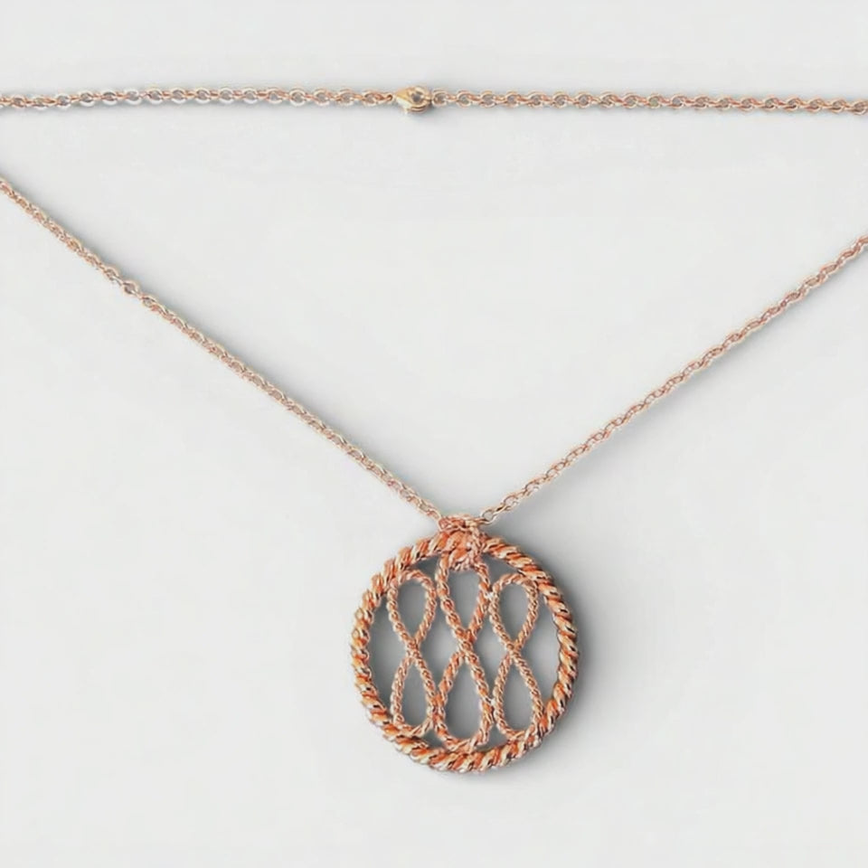 This pendant embodies the principle of eternal renewal and flame protection through its fluid, symmetrical spiral-loops — resembling a series of infinity symbols anchored within a unified copper field. The design is elegant, spacious, and deliberate — a transmission of the descending and ascending flame currents meeting in the body.